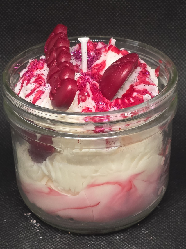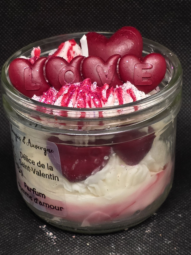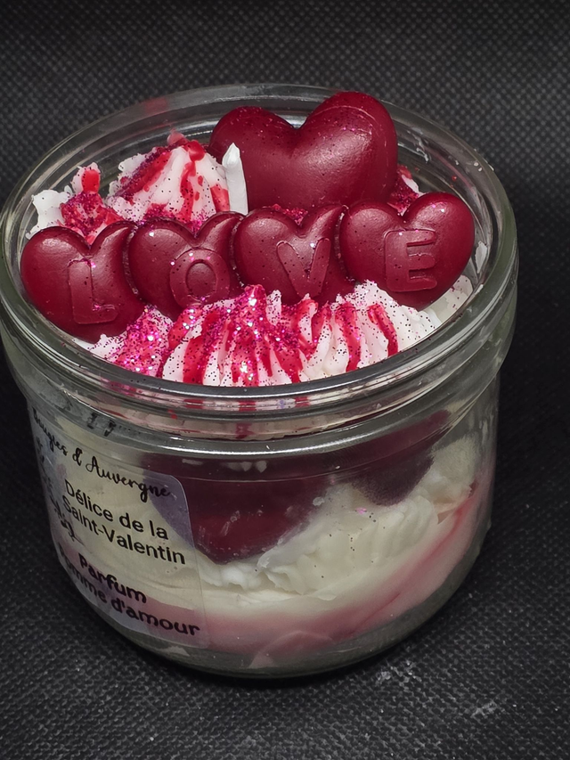 Succombez au charme de notre bougie "Délice de la Saint-Valentin", une création unique signée Bougies d'Auvergne. Présentée dans un élégant pot en verre, cette bougie gourmande se distingue par sa texture aérienne en chantilly de cire, parsemée de paillettes scintillantes et surmontée de cœurs rouges passion épelant le mot "LOVE".