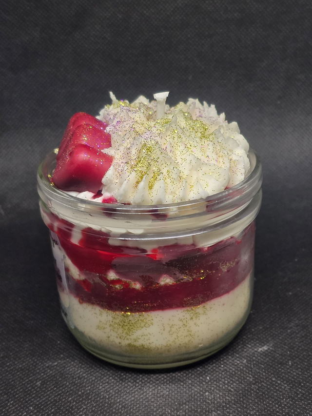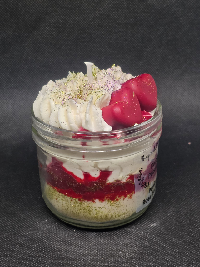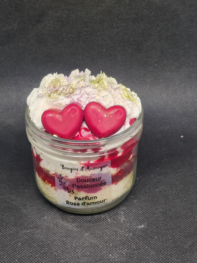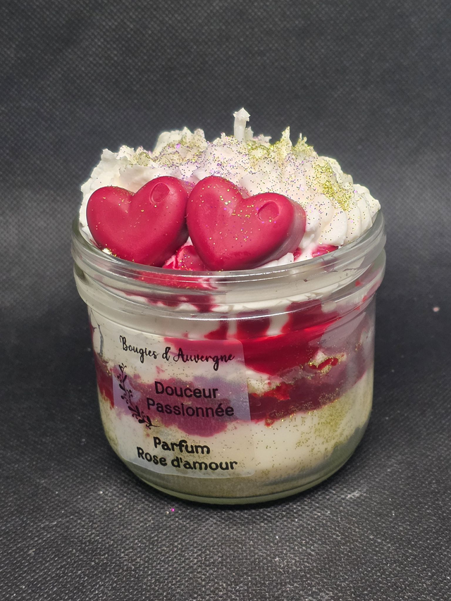 Véritable objet de décoration, cette bougie artisanale capture l'essence même de la romance. Présentée dans son bocal en verre, elle révèle un magnifique travail de textures : une base onctueuse surmontée d'une chantilly aérienne parsemée de paillettes scintillantes et de deux cœurs rouge passion.
