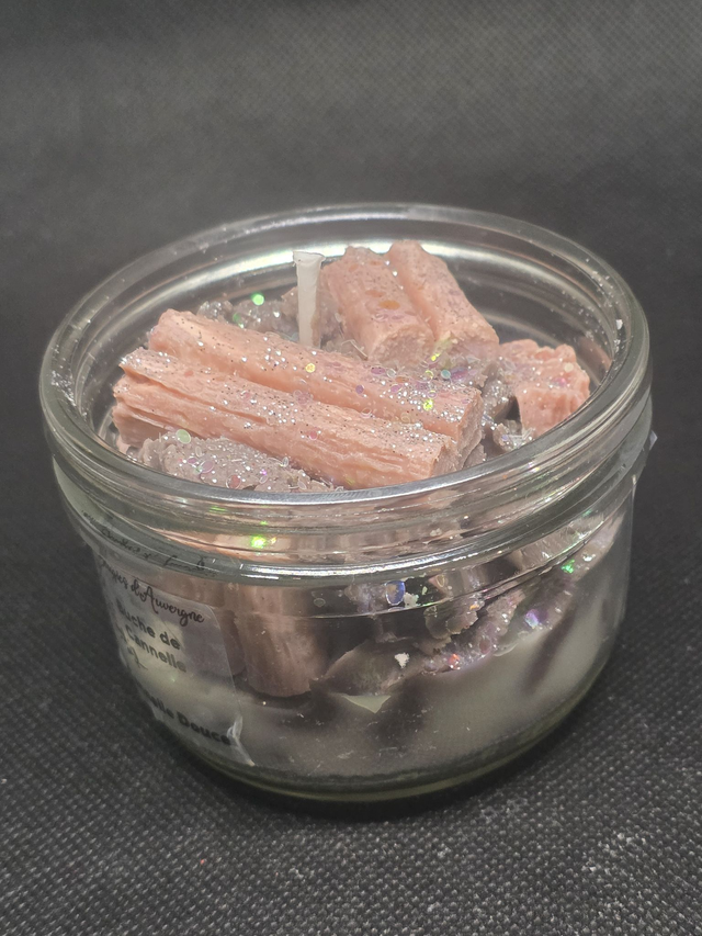 Plongez dans une atmosphère chaleureuse avec notre bougie "Bûche de Cannelle". Entièrement coulée à la main par Bougies d’Auvergne, cette création originale se distingue par son design unique : des bâtonnets de cannelle en cire délicatement disposés et saupoudrés de paillettes biodégradables.