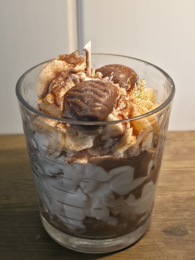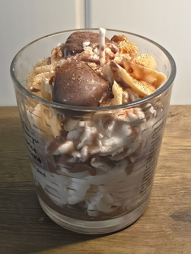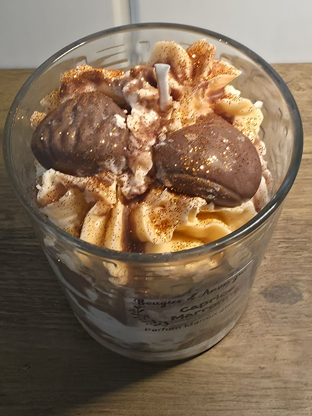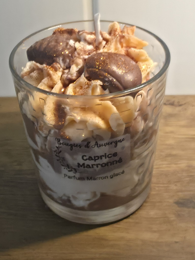Succombez à la tentation avec notre bougie parfumée Caprice Marronné par Bougies d'Auvergne. Une création artisanale qui imite à la perfection un dessert glacé, surmontée de cœurs au marron glacé et d'une touche d'éclat. Son parfum chaud et réconfortant de Marron Glacé est une pure gourmandise olfactive.