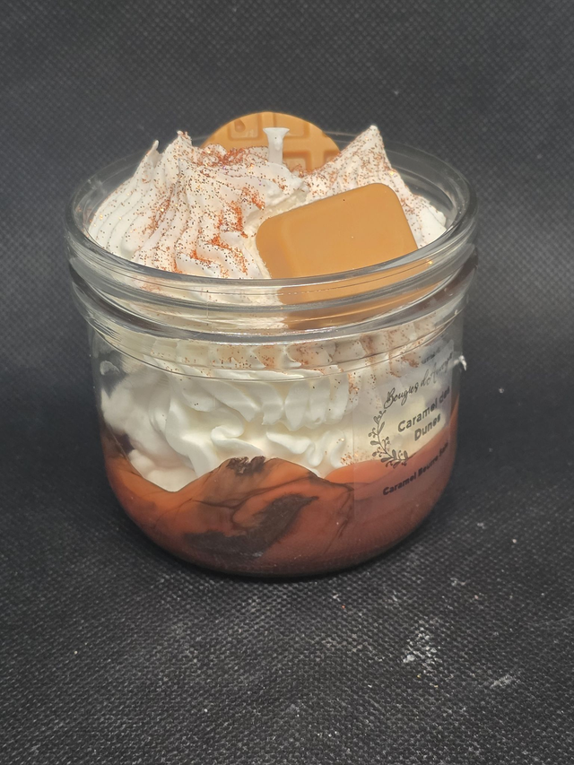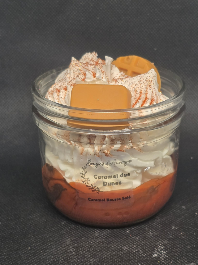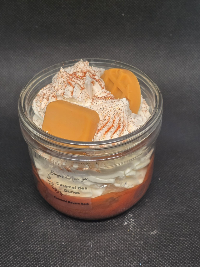 Succombez à la tentation visuelle et olfactive avec la bougie Caramel des Dunes. Cette pièce artisanale imite à la perfection un dessert gourmand :
