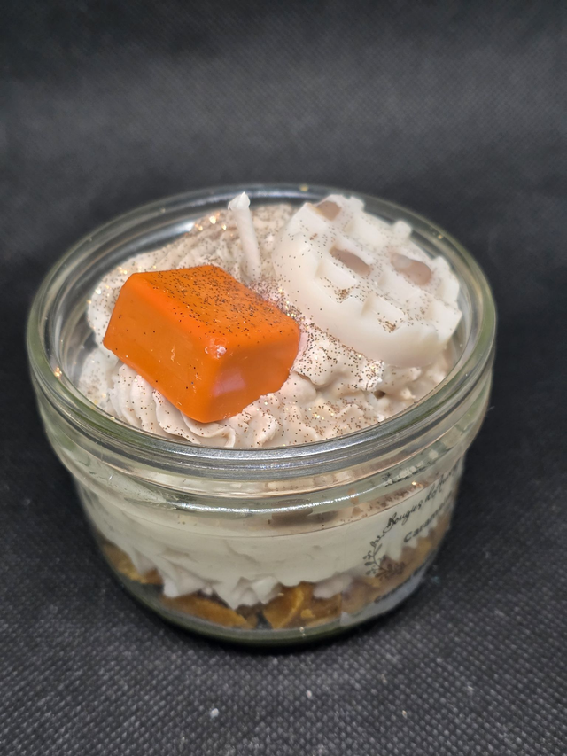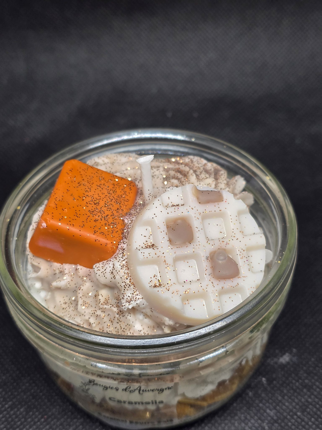 Véritable délice visuel et olfactif, cette bougie artisanale capture l’essence même de la gourmandise. Présentée dans son bocal en verre, elle dévoile une texture onctueuse surmontée d'une gaufre et d'un carré de caramel ultra-réalistes, le tout saupoudré de paillettes scintillantes.