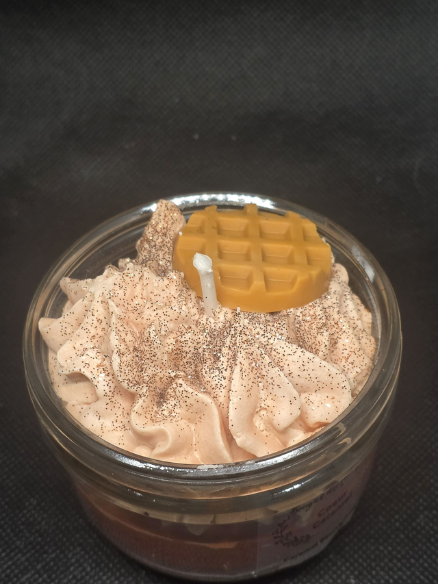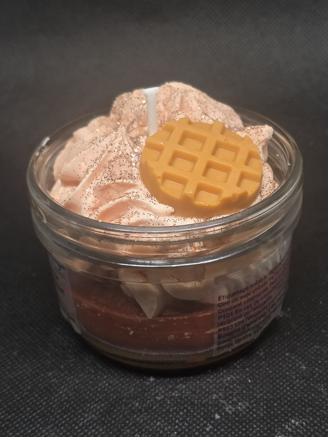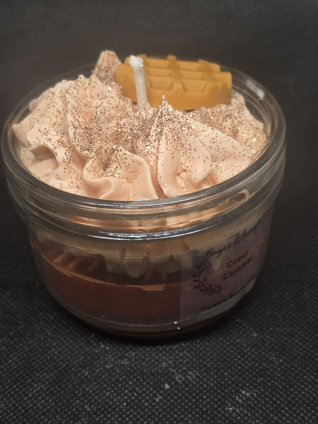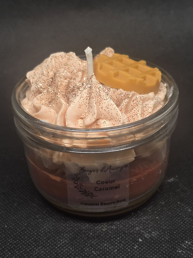Succombez à la gourmandise absolue avec cette bougie artisanale "Coeur Caramel". Présentée dans un élégant bocal en verre, elle se compose d'une base onctueuse au parfum de caramel au beurre salé, surmontée d'une chantilly de cire aérienne délicatement pailletée. Pour parfaire ce dessert olfactif, un petit insert en forme de gaufre vient décorer le sommet. Une création visuelle et sensorielle signée Bougies d'Auvergne, idéale pour instaurer une ambiance chaleureuse et cocooning chez vous.