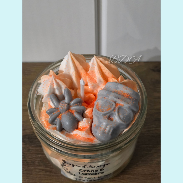 Découvrez la bougie Crâne & Lumière, une création originale des Bougies d'Auvergne qui allie l'artisanat français à une esthétique audacieuse. Cette bougie parfumée est un véritable objet de décoration avec ses couleurs blanche et orange et ses motifs de crâne et d'araignée en cire.