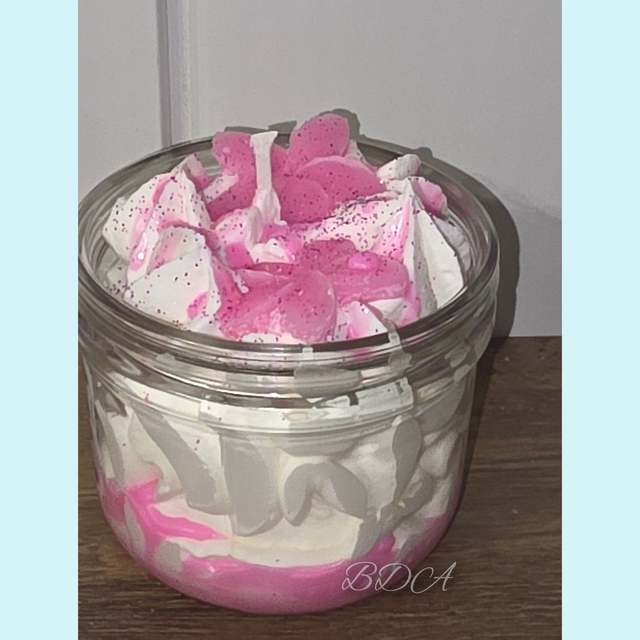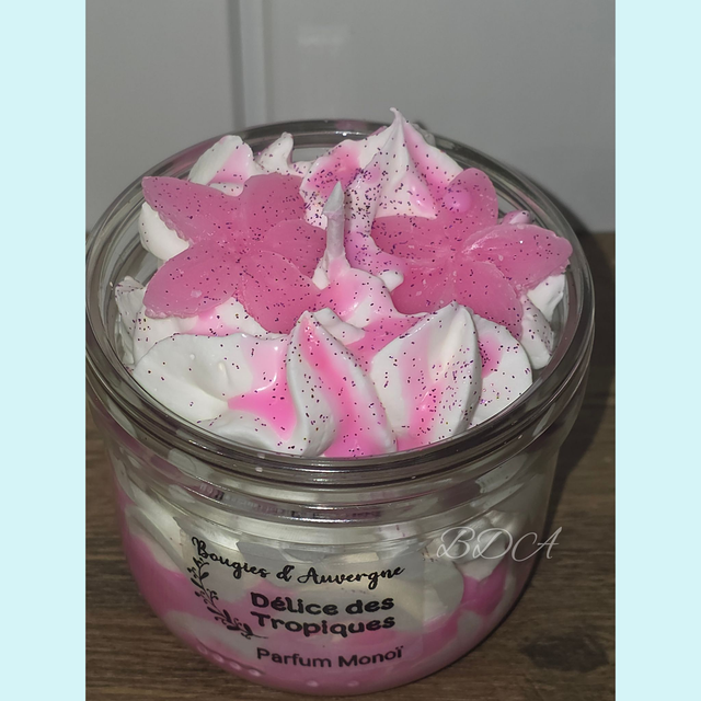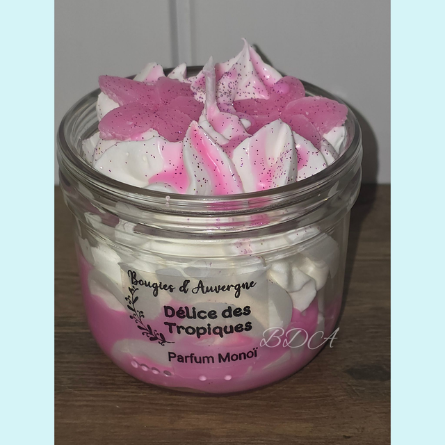 Évadez-vous vers une plage de sable chaud avec ma nouvelle création ! 🌴 Cette bougie "Délice des Tropiques" est une véritable invitation au voyage. Avec ses jolies fleurs roses, son effet chantilly gourmand et le doux parfum de Monoï, elle transforme votre intérieur en un coin de paradis. Parfait pour une ambiance relaxante.