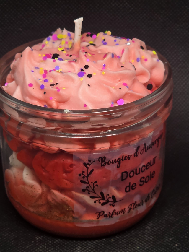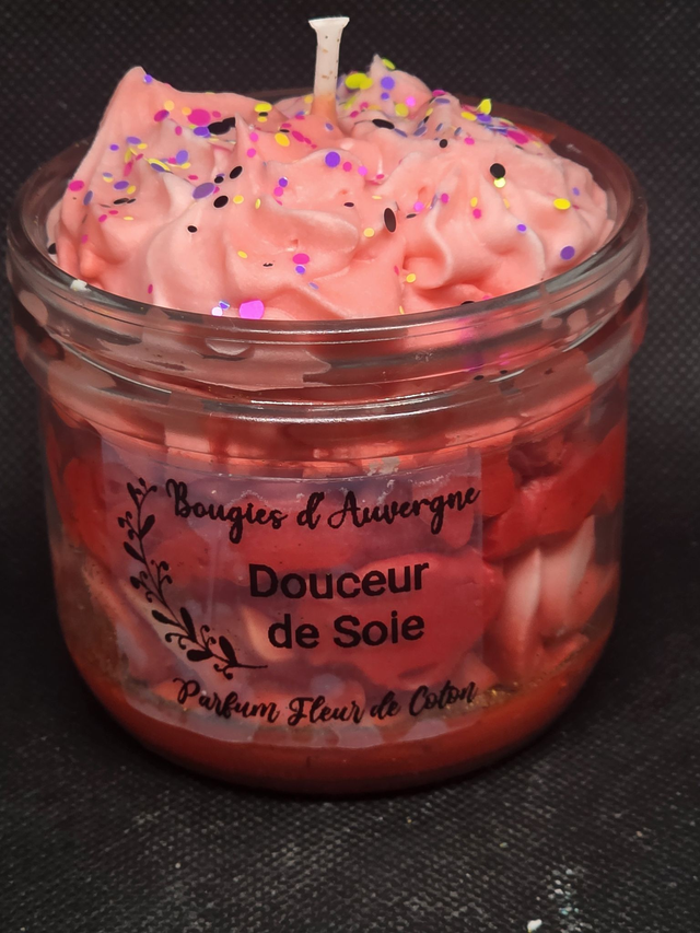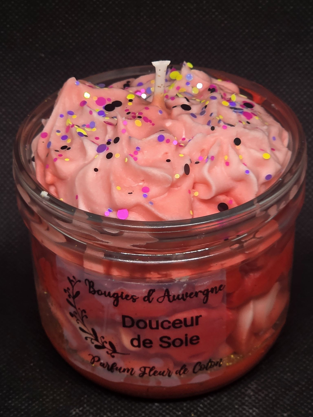 Découvrez la bougie artisanale Douceur de Soie, une création unique au visuel gourmand et aérien. Sa chantilly de cire rose, parsemée de paillettes festives, diffuse le parfum délicat et apaisant de la Fleur de Coton. Fabriquée à la main en Auvergne, elle est l'atout charme idéal pour créer une ambiance cocooning et raffinée chez vous.