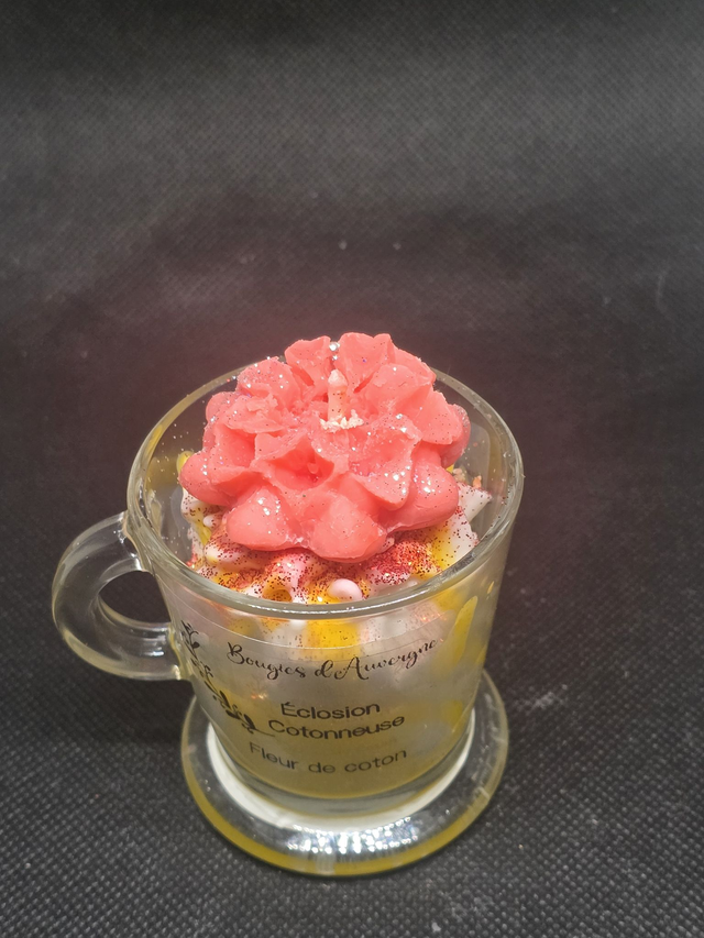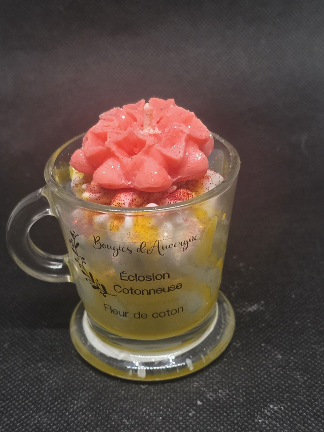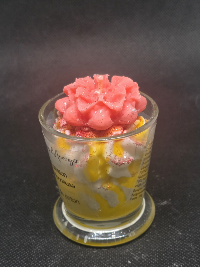 Présentée dans une élégante tasse en verre, cette bougie est une véritable pièce de décoration. Elle se compose d’une base onctueuse aux reflets dorés, surmontée d'une chantilly de cire parsemée de paillettes scintillantes et couronnée d'une magnifique fleur sculptée rose.