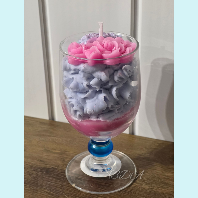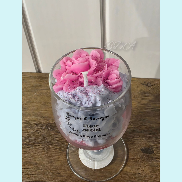 Un véritable chef-d'œuvre artisanal. Dans une élégante coupe de champagne, des fleurs délicatement sculptées en cire se déploient en deux teintes, rose et mauve pailleté. Son doux parfum de Rose Éternelle transformera votre intérieur en un havre de paix. Une pièce unique et raffinée pour illuminer vos soirées.