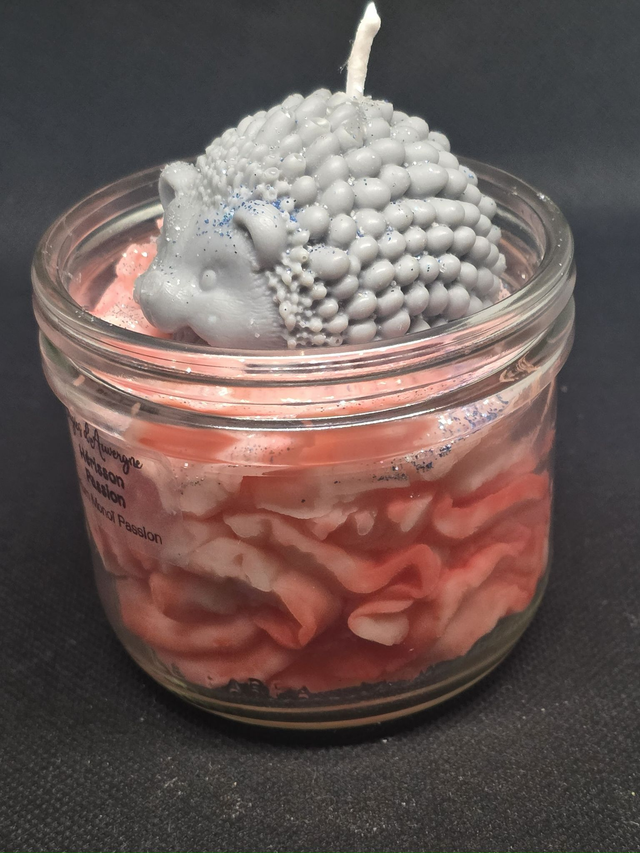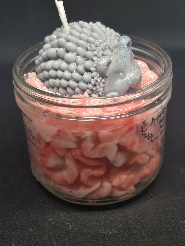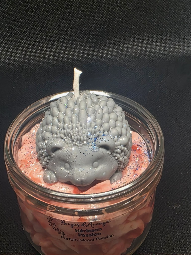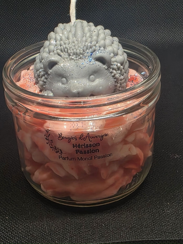 Découvrez l'enchantement de notre bougie Hérisson Passion, une création unique des Bougies d'Auvergne. Niché au cœur d'un pot en verre réutilisable, un adorable hérisson gris scintillant, parfumé à la Monoï Passion, trône sur une base de cire rouge très clair texturée. Plus qu'une simple bougie, c'est un objet décoratif qui éveillera vos sens et apportera une touche d'originalité et de douceur à votre intérieur. Parfait pour une ambiance relaxante et exotique.