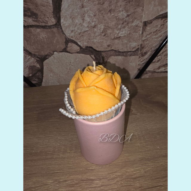 "Offrez un rayon de soleil et un doux message avec nos bougies roses artisanales 💛. Parfaites pour offrie une jolie fleur ou simplement exprimer votre amour. Chaque bougie est fabriquée avec passion en Auvergne pour illuminer les cœurs.