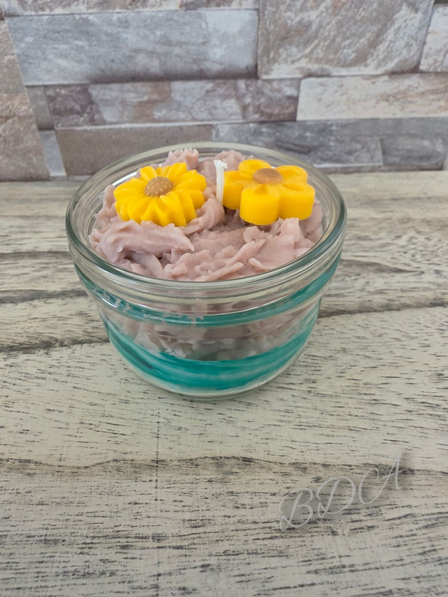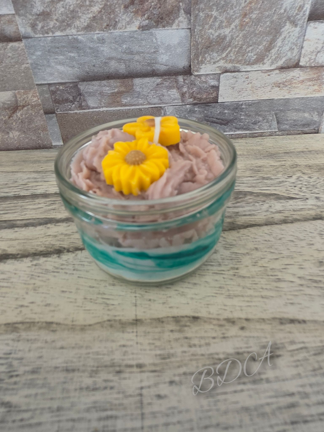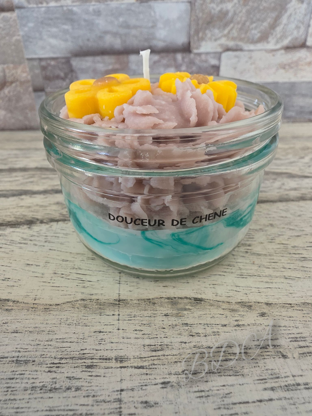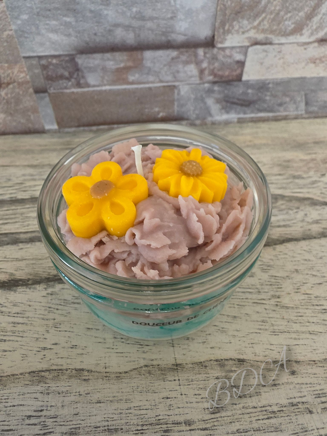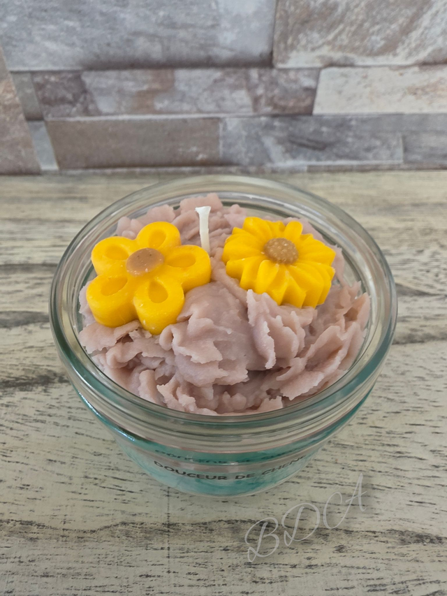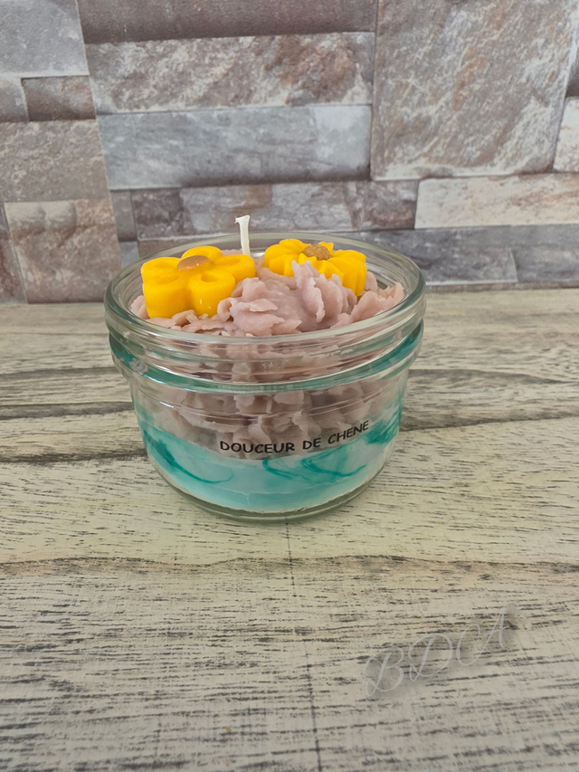 Bougie pot marbré vert avec sa chantilly marron et ses 2 petites fleurs au parfum douceur de chêne.