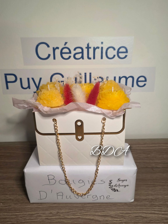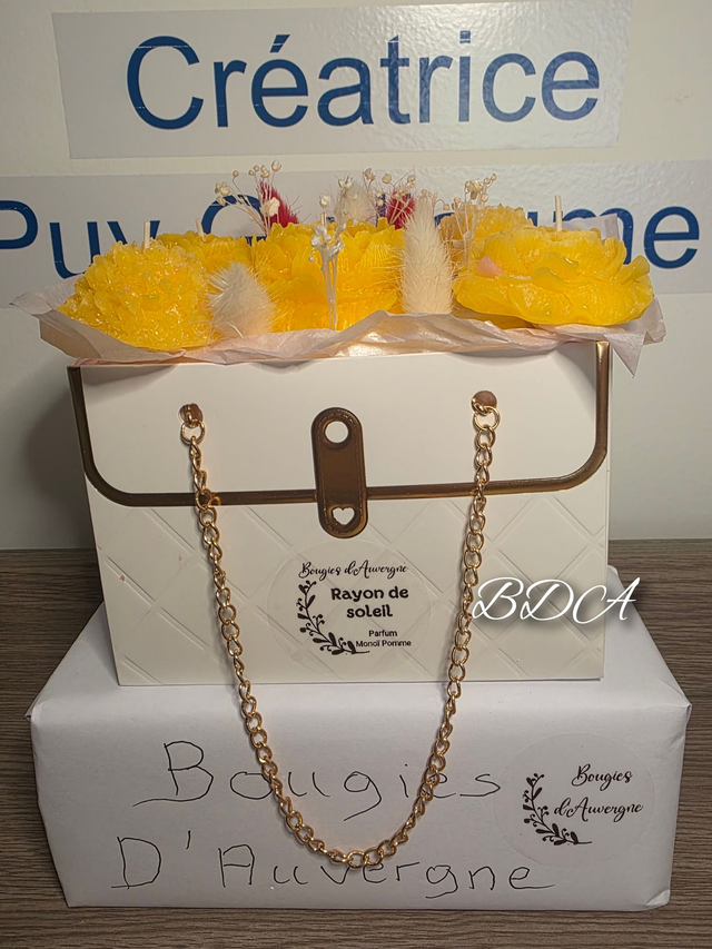 Un rayon de soleil en bouquet ! ☀️ Ma bougie fleurie "Rayon de Soleil" parfumées au Monoï Pomme, présentées dans un adorable sac-chaîne, pour apporter lumière et douceur à votre intérieur. ✨ Fait avec amour par votre Créatrice à Puy-Guillaume !