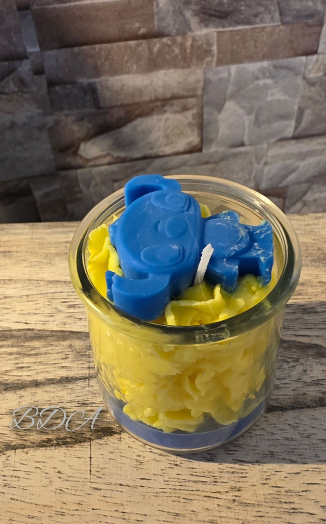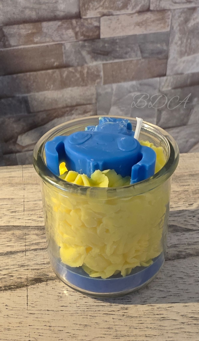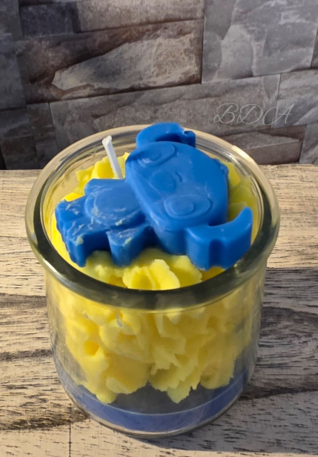 La bougie stitch sur sa cire bleu avec sa chantilly jaune et son stitch au dessus tout ceci au parfum vanille épicée